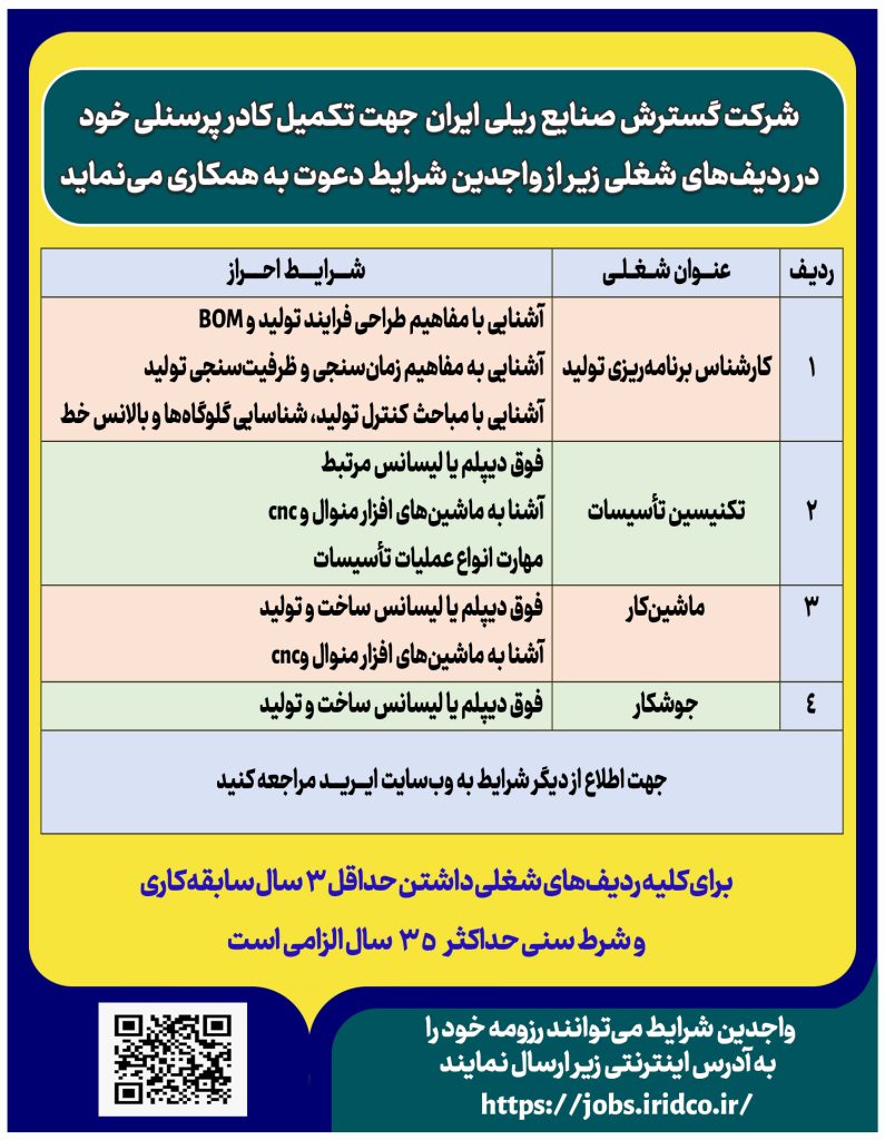 شرکت دانشبنیان گسترش صنایع ریلی ایران جهت تکمیل کادر خود از متقاضیان استخدام مینماید.
